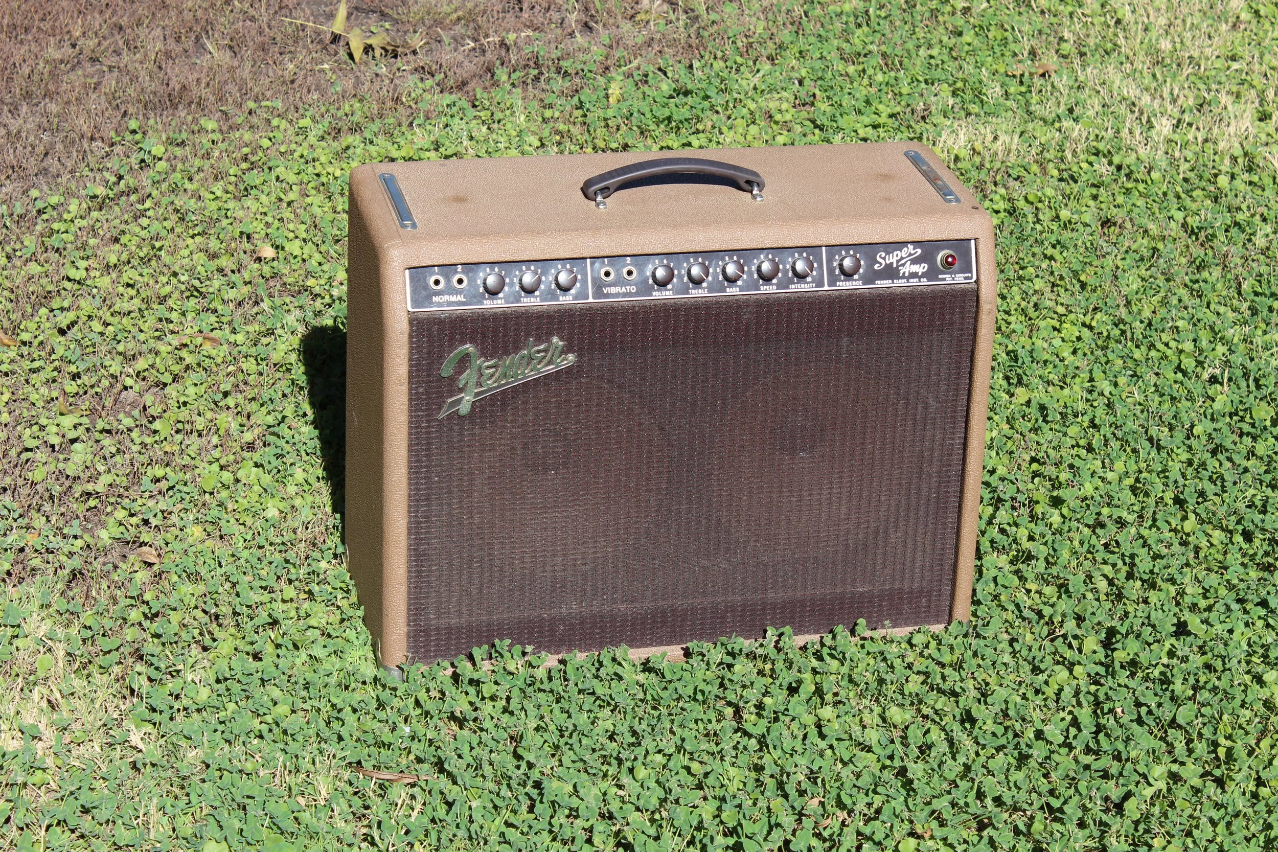 This is 1963 Fender Brown Super. It came working but with lots of sloppy work inside and many of the replace components seemed to have been whichever parts the people who serviced had at the moment and they were radically different values than stock. After correcting those issues the amp sounds amazing!! The 2x10 cab and 35W rate make it the perfect light gigging amp.