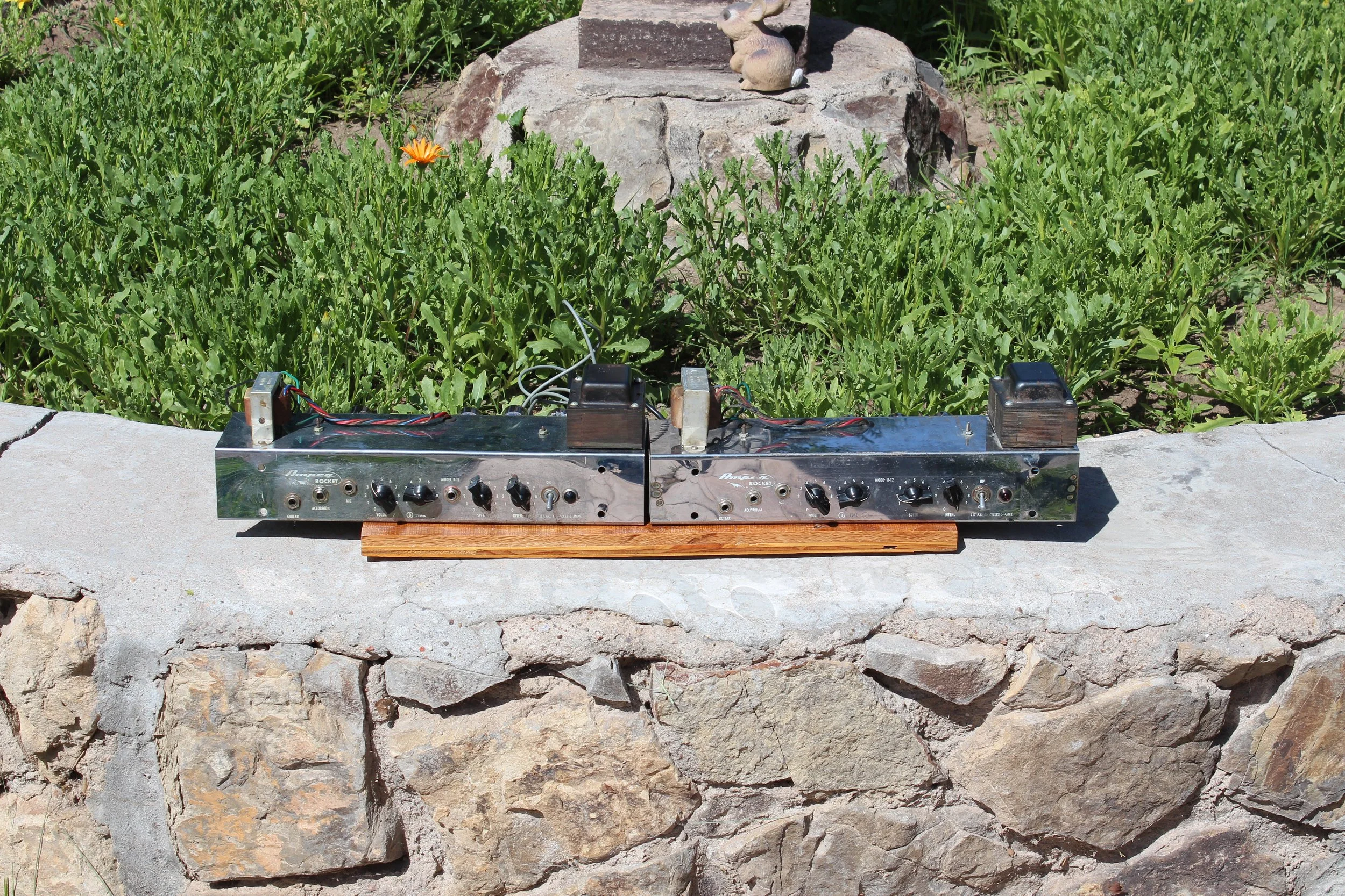 This Bogen PA was once used as a school intercom. Where the bolts are now had buttons for different class rooms. Funnily enough the inside was a lot like a Champ. I made it in a Tweed Princeton with a 6L6 output!