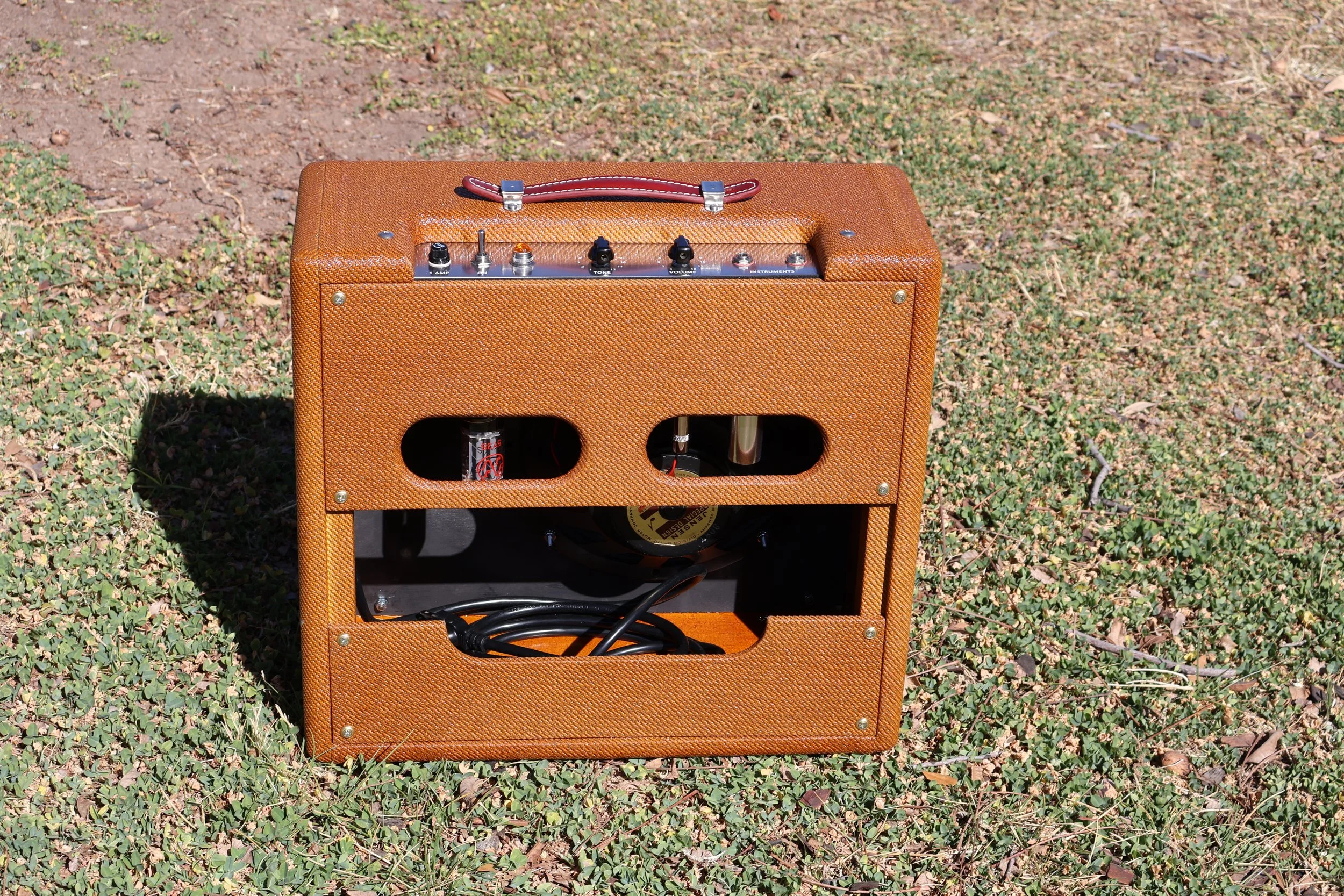 Our most popular small amp is our version of the late 50’s 5F1 Champ. It’s small size is dwarfed by it’s huge tone! See the Classic Tweed Champ page for more details.